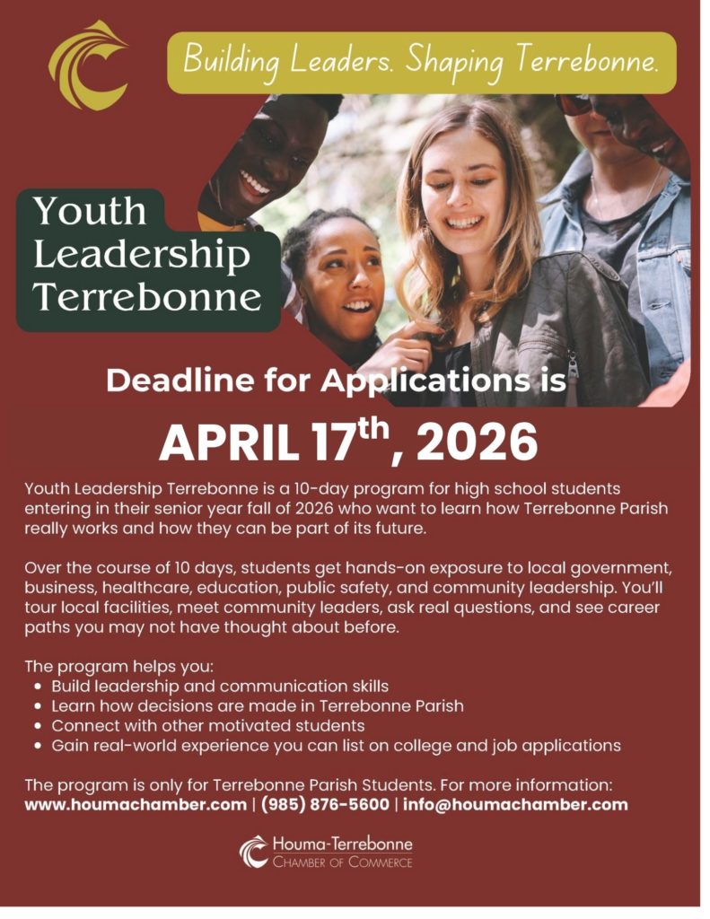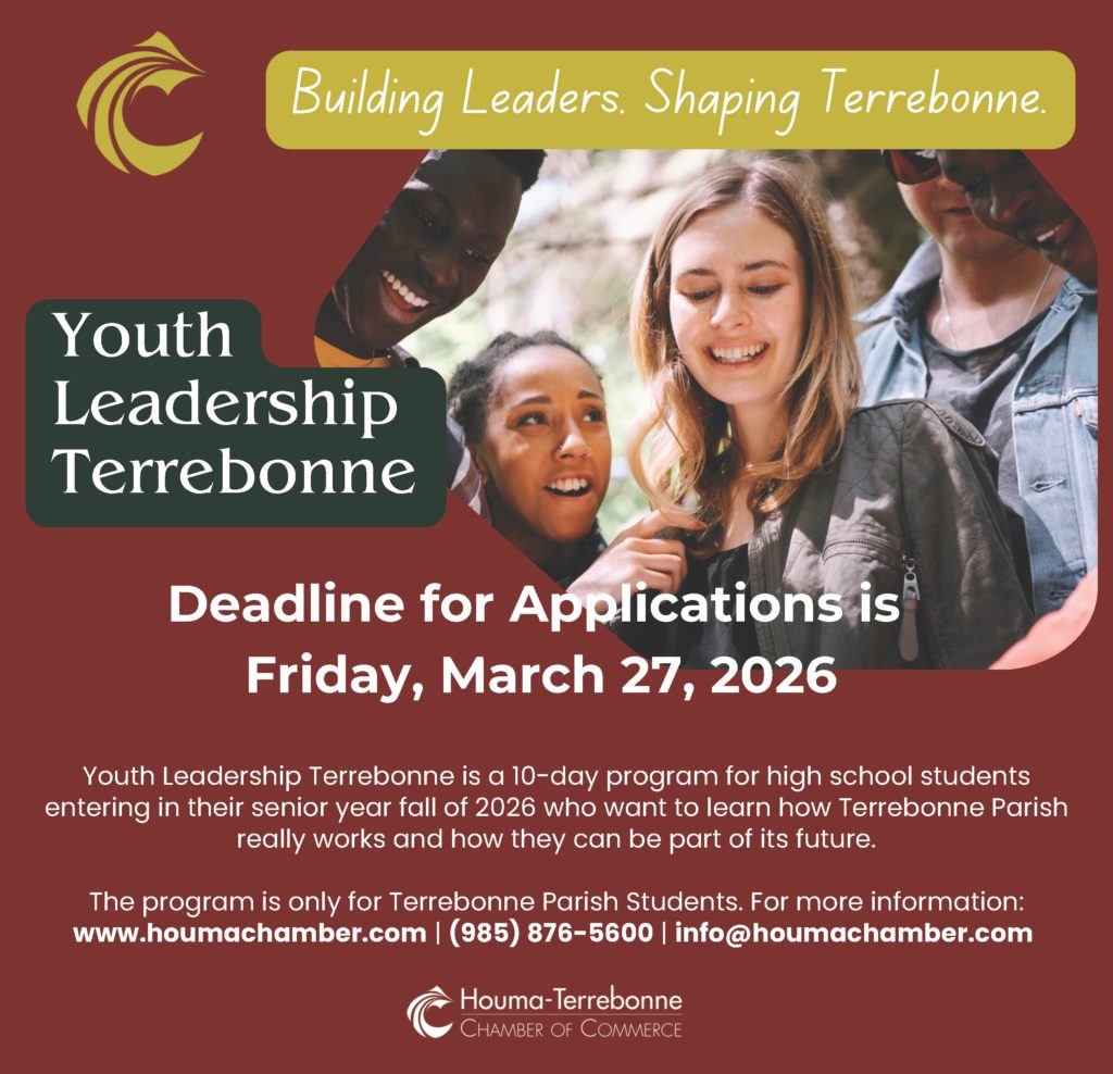 Youth Leadership Terrebonne is a 10-day program for high school students entering into their senior year fall of 2026 who want to learn how Terrebonne Parish really works and how they can be part of its future.